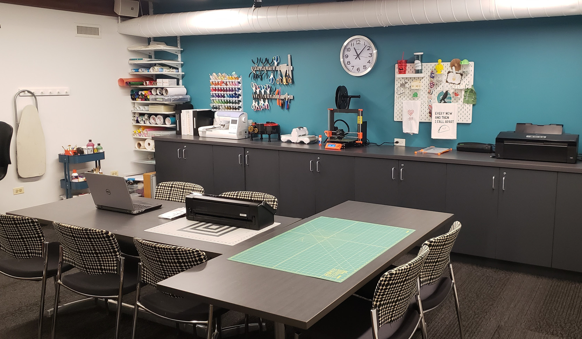 The Creative Studio is a space for making, learning, and crafting. We encourage you (the patron) to explore projects and ideas on your own and then use the Creative Studio to transform your ideas into reality. The Creative Studio is reserved specifically for the use of creating. Patrons may use other areas in the Library to read, relax, or do other work not related to DIY projects.